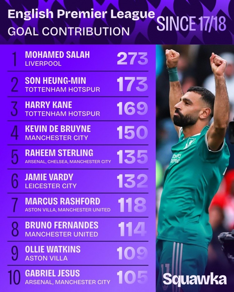 9月15日讯 自萨拉赫在17/18赛季登陆英超后,他是英超联赛直接参与进球数最多的球员。