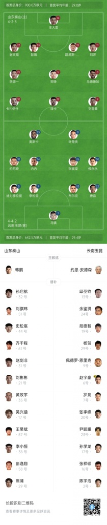 目前,山东泰山12胜6平7负积42分位列中超第6,近6轮比赛泰山4胜2平保持不败;云南玉昆8胜7平10负积31分位列中超第10,球队近期3负2平连续五轮不胜。本赛季双方首回合比赛,泰山遭玉昆让二追三逆转。