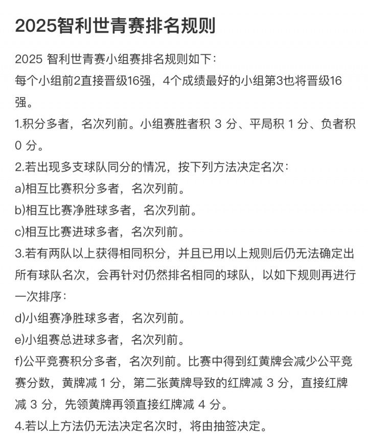 最终,智利和埃及两队的积分、相互战绩、小组赛净胜球、小组总进球数据一模一样,智利以公平竞赛分力压对手排名第二晋级。